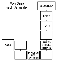Unterwegs finden wir eine Art Oase, deren Wasser wir aber nicht trinken dürfen, da es vergiftet ist. Stattdessen erreichen wir eine Treppe, die wir hinabsteigen. Unten entdecken wir einen kleinen See, dessen Wasser genießbar ist ( drink water ). Kurz darauf stehen wir auch schon vor den Toren Jerusalems, wo uns vier Männer aufhalten wollen. Wir geben jedem von ihnen eine Kupfermünze ( give copper ). Den Wächter des zweiten Tores schüchtern wir mit dem Schwert ein ( F8 ).