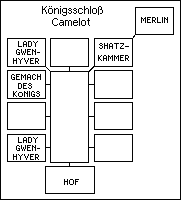 In unserem Schlafgemach wechseln wir unsere Kleidung ( change clothes ) und stecken die Geldbörse ein ( take pouch ). Unser Weg führt uns in die Schatzkammer, wo wir uns mit einigen Münzen eindecken ( give purse to man, gold, silver, copper ). Nachdem wir die Geldbörse zurückverlagnt haben ( take purse ), machen wir uns auf den Weg zu Merlin. Bei ihm können wir eine Menge wichtiger Dinge erfahren. Wir betrachten die Landkarte (look map) und lesen die Schriftrolle ( look scroll, read scroll ), die auf dem Tisch liegt. In der Truhe neben dem Tisch finden wir einen Kompaß, den Merlin für uns hergestellt hat (open chest, take lodestone). Anschließend betreten wir die Kapelle und opfern beiden Göttern je eine Goldmünze (kneel, give gold, stand). Da nun aber unsere Geldbörse wieder etwas erleichtert wurde, suchen wir erneut die königliche Schatzkammer auf ( give purse to man, gold, take purse ). Wir sind jetzt fast bereit, aufzubrechen, um das Geheimnis des Grals zu lüften und unsere Ritter zu suchen und zu finden. Vorher sollten wr uns jedoch noch bei Königin Gwenhyver sehen lassen. Wir befragen sie diskret nach ihrem heimlichen Liebhaber aus und können auch sonst noch einiges von ihr erfahren ( talk to queen, ask about Gawaine, ask about Launcelot, ask about Mad Monk, ask about black knight, ask about Merlin ). Wir überreichen ihr eine Rose als Symbol für unsere Liebe zu ihr ( take rose ) und verabschieden uns ( kiss Gwenhyver ). Im Schloßhof sprechen wir mit den Wachen ( talk to man ) und besteigen danach unser Schlachtroß ( mount horse ). Die Reise kann beginnen! Unser Weg führt uns zunächst nach Glastonbury Tor und zum Ot Moor.
