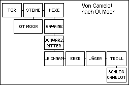 Auf dem Weg dorthin werden wir einige Gefahren bestehen müssen. Als erstes treffen wir auf einen geldgierigen Troll. Um seinen Hunger nach Reichtum zu stillen, müssen wir ihm eine Kupfermünze schenken ( give copper ). So gelangen wir an ihm vorbei und begegnen im Westen einem treuen Untertanen, der sich gerade von der anstrengenden Jagd ausruht. Wir schenken ihm eine Kupfermünze ( give copper ), um von ihm Auskunft über den Mönch, der in der Ruine von Glastonbury Tor haust, und über den verschollenen Sir Gawaine zu erhalten ( ask about Mad Monk, ask about Gawaine ). Um ihm und uns eine Freude zu machen, kaufen wir ihm seine Felle ab ( give gold, take pelts ) und erhalten so auch noch seinen Speer dazu ( take spear ). Der Jäger befestigt diesen an der Flanke des Pferdes und verabschiedet sich dankbar bei uns. Wir reiten weiter in Richtung Westem, unbeeindruckt von der Reaktion des Maultiers. Hier lauern verrückt gewordene drei Wildschweine im Gebüsch auf uns. Wir wehren uns mit dem eben erworbenen Speer ( Space-Taste drücken ). Sobald ein Eber die Vorläufe des Pferdes erreicht hat, stoßen wir zu und befördern es so ins Jenseits. Diesen Vorgang weiderholen wir dreimal und reiten dann weiter nach Westen, wo wir eine Krähe, die auf einem Stein hockt, ansprechen ( talk to crow ). Nachdem wir ihre Frage positiv beantwortet haben ( yes ), fliegt sie davon. Wir betrachten den Leichnam ( look skeleton) und schnappen uns das Seidenstoffstück, bevor es der Wind wegträgt (take silk ). Auf dem weiteren Weg werden wir auf eine der härtesten Proben der ganzen Gral-Suche gestellt. Hier erwartet uns der Schwarze Ritter, der uns den Durchgang versperren will. Um passieren zu können, müssen wir sein Angebot annehmen und ihn dreimal von seinem hohen Roß stoßen ( yes ). Um erfolgreich zu sein, müssen wir im Duell die Lanze kreisen lassen und den Schild auf mittlerer Höhe halten. Mit etwas Übung, viel Geduld und öfterem Abspeichern überwinden wir auch diese Hürde. Wir begegnen darauf den an einem Baum gefesselten und reichlich erschöpften Sir Gawaine, den wir auch gleich befreien ( cut shackles ). Um nicht umkehren zu müssen, setzen wir ihn auf unser Pferd, das den Weg zum Schloß kennt, und schicken es los ( put Gawaine on horse ). Danach stoßen wir auf eine Hexe, die sich aber verwandelt, wenn wir ihr den Seidenstoff aushändigen und somit den Zauber brechen ( give silk ). Wenn sie weggelaufen ist, können wir auch die Inschriften lesen, die in den Steinsockel eingraviert wurden ( read inscription ).